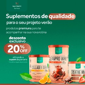 Regras: Desconto de 20% OFF no site oficial da Nutrify. Válido para todas as compras feitas no site oficial. Cupom cumulativo com outras promoções do site, exceto categoria moda e acessórios. Cupom não cumulativo com outros cupons. O desconto não abrange o frete.